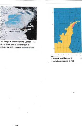 Larsen Ice Shelf: “The Larsen Ice Shelf is a long, fringing ice shelf in the northwest part of the Weddell Sea, extending along the east coast of the Antarctic Peninsula from Cape Longing to the area just southward of Hearst Island…the Larsen Ice Shelf is a series of three shelves that occupy (or occupied) distinct embayments along the coast. From north to south, the three segments are called Larsen A (the smallest), Larsen B, and Larsen C (the largest). The Larsen A ice shelf disintegrated in January of 1995. The Larsen B ice shelf disintegrated in February of 2002. The Larsen C ice shelf appears to be stable. The Larsen disintegration events were unusual. Typically, ice shelves lose mass by iceberg calving and by melting at their upper and lower surfaces. The disintegration events are linked to the ongoing climate warming in the Antarctic Peninsula, about 0.5 degrees C per decade since the late 1940’s (almost certainly a result of global warming).” (Sciencedaily.com)