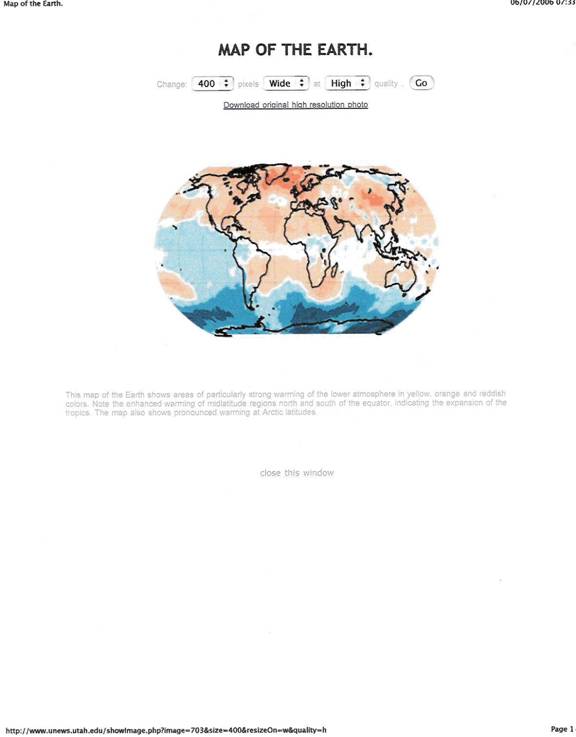 Earth’s Tropical Belt Moving North and South: Over the past 26 years the Earth’s tropical belt of warmer air has widened by over 140 miles (2 degrees in latitude) moving towards the north and south poles, according to Qiang Fu, and Thomas Reichler, professor of Meteorology at University of Utah and Professor John M. Wallace of University of Washington in Seattle, and who were all part of a study team investigating this. This warming of the atmosphere at these latitudes causes the troposphere to bulge toward each pole, which gently pushes the north and south jet streams farther north and south respectively. Such an event is believed to be causing the expansion of the subtropical deserts into heavily populated mid-latitudes (i.e. the Sahel area of Africa just south of the Sahara region, southern Europe and the southern part of the United States, lower parts of South America, just to name a few areas.) “It’s a big deal. The tropics may be expanding and getting larger,” says study co-author Thomas Reichler…“If this is true, it also would mean that subtropical deserts are expanding into heavily populated midlatitude regions.” This will, if it continues, shift rain and snow precipitation toward the poles. Currently, the troposphere over the period of this 26 years has warmed 1.5 degrees Fahrenheit. [To read the full News Release from the University of Utah, click on http://www.unews.utah.edu/p/?r=051906-1 ]