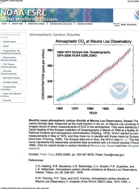 As we have just seen, the National Oceanic and Atmospheric Administration, NOAA, has said that for this year of 2006, in May, there was a continuing rise in carbon dioxide and nitrous oxide, though methane leveled off. There was also a decline in chlorofluorocarbons, gases that contribute to the ozone hole over the Antarctic. Currently the concentration of carbon dioxide in the atmosphere has climbed to a record 381 parts per million last year…the reading up 2.68 ppm according to NOAA’s David J. Hofmann. In addition to C02, the 2004 data from WMO calculated nitrous oxide, which has been steadily rising since 1988, totaled 318.6 ppb. Methane has risen the most dramatically over the past two centuries, with the total amount in 2004 at 1,783 ppb, but its growth has been slowing down, according to the World Meteorological Organization. Said Leonard Barrie of WMO, “If you have that much more energy being trapped, where does it go? [keep that question in the back of your mind, it’s important]...Given the lifetime of carbon dioxide in the atmosphere is 50 to 200 years depending on how you calculate it…it doesn’t take a nuclear scientist to state that we’re going to have this problem for a long time…If we stop now C02 emissions to the atmosphere, it would take 50 to 100 years before we were starting to see approaches to pre-industrial levels.” Scientists worry that overall warming will melt glaciers and the polar ice caps, raising sea levels enough to damage many low-lying islands and cities around the world. In addition, warmer climate could lead to changes in weather patterns, agriculture and even allow some diseases to expand into new areas. [March 15, 2006, Associated Press]