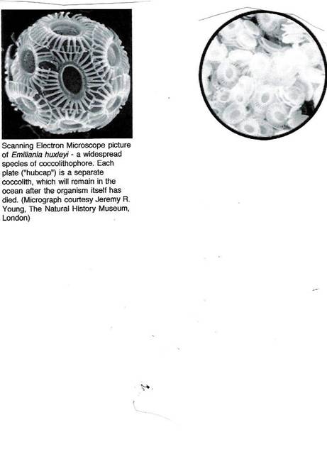 Coccolithophores: Coccolithophores are a type of phytoplankton that do not require rich nutrients to survive and reproduce, but flourish in warmer, nutrient poor seas. They live mainly in subpolar regions. They are one-celled marine plants that live in large numbers in the upper layers of the oceans. They have a very unique makeup. They, through their unique body chemistry, surround themselves with microscopic “plating” made of CaC03, calcite, or commonly known as limestone. These plates resemble hubcaps and measure about three one-thousandths of a millimeter in diameter. They can have up to thirty of these “hubcaps” attached to their round bodies. These hubcaps are called coccoliths. As additional coccoliths are formed, the excess ones drop into the water, sinking to the bottom. Also when a coccolithophore dies, it sinks along with all its hubcaps of CaC03. In areas of trillions of these one-celled C02 scrubbers, the water will turn opaque turquoise from dense clouds of them. Scientists estimate that these organisms dump more than 1.5 million tons of calcite (CaC03) onto the ocean floors every year. [see http://earthobservatory.nasa.gov/Library/Coccolithophores/ and http://earthobservatory.nasa.gov/Library/Coccolithophores/coccolith_3.html ] Coccolithophores’ short-term effect on the environment is a little more complex. The chemical reaction to form the coccoliths, in locking away a C02 molecule into one molecule of CaC03, releases one molecule of C02 back into the water and/or atmosphere. But as a plant cell, it is also absorbing C02 in photosynthesis. So this effect must be minimal, and the coccoliths constant falling to the sea-floor provides a constant scrubbing of C02. Also the color of these one-celled hubcap phytoplankton is reflective to sunlight, helping lower the surface temperature of the ocean where they are proliferating. [see also http://earthobservatory.nasa.gov/Study/Coccoliths/bering_sea.html and http://earthobservatory.nasa.gov/Study/Coccoliths/bering_sea_2.html and http://earthobservatory.nasa.gov/Study/Coccoliths/bering_sea_3.html and http://earthobservatory.nasa.gov/Study/Coccoliths/bering_sea_4.html for a full treatment of this subject.]