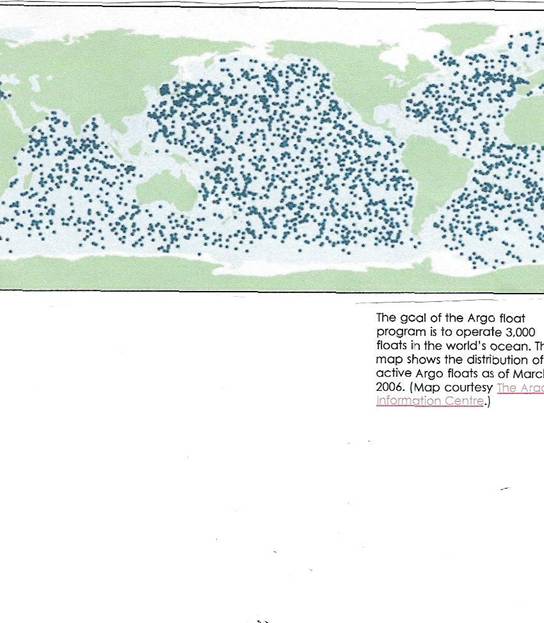 In 1992 NASA and the French Centre National d’Etudes Spatiales launched the TOPEX/Poseidon oceanography satellite; in 2001 they launched the successor, Jason 1…The Jason-1 doesn’t work alone, the international Argo float program compliments the satellite’s observations. By the end of 2006, the Argo program is expected to operate 3,000 floats, mechanical devices that measure temperature and salinity, drifting at specified depths and spaced roughly every 3 degrees (at the Equator, this equals 360 kilometers, or 120 miles apart)…After combining all this information, Willis, a partner with Hansen, found that between mid-1993 and mid-2003, the heat content of the upper 750 meters of Earth’s global ocean increased at an average rate of 0.86 watts (plus or minus 0.12 watts) per square meter (measuring an area of 337 trillion square meters, 93 percent of the ocean).