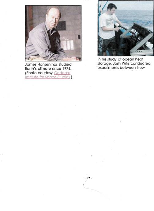 Two Categories of Ocean Temperatures: Ocean temperatures actually fall into two categories, “It’s important to make a distinction between warming at different depths. People are most familiar with sea surface temperature because that’s where we live. But a lot of this action and this heat-content signal are really beneath the surface of the ocean, and you have to go hundreds of meters in depth to measure it. And what’s going on right at the surface and what’s going on at depth can sometimes be different.” Sea surface temperature is a bigger driver of weather, but ocean temperature at depth tells researchers more about the planet’s energy imbalance.” [ http://earthobservatory.nasa.gov/Study/HeatBucket/heatbucket2.html ] In 1988 Hansen testified before Congress, describing how different levels of greenhouse gases might effect future temperatures. Over the next 17 years, observed temperatures closely agreed with Hansen’s 1988 predictions…Hansen explains, if increasing greenhouse gases are exerting pressure on the planet’s climate, the gases should create an energy imbalance in which the Earth absorbs more energy than it radiates back to space. Because most of the planet is ocean-covered and because those oceans have a high heat capacity, excess energy should show up in the oceans”—and at first be hidden within them. “Hansen and his collaborators ran five climate simulations covering the years 1880 to 2003 to estimate change in Earth’s energy budget. Taking the average of the five model runs, the team found that over the last decade, heat content in the top 750 meters of the ocean increased by 6.0 watts-years per square meter (plus or minus 0.6 watt-years). (A watt-year is the amount of energy delivered by one watt of power over one year.) What kind of energy imbalance would it take to generate that much heat? The models predicted that as of 2003, the Earth would have to be absorbing about 0.85 watts per square meter more energy than it was radiating back into space—an amount closely matched by measurements of ocean warming that Willis had compiled in his previous work. The Earth, they conclude, has an energy imbalance. “I describe this imbalance as the smoking gun or the innate greenhouse effect,” Hansen says. [ http://earthobservatory.nasa.gov/Study/HeatBucket/heatbucket3.html ]